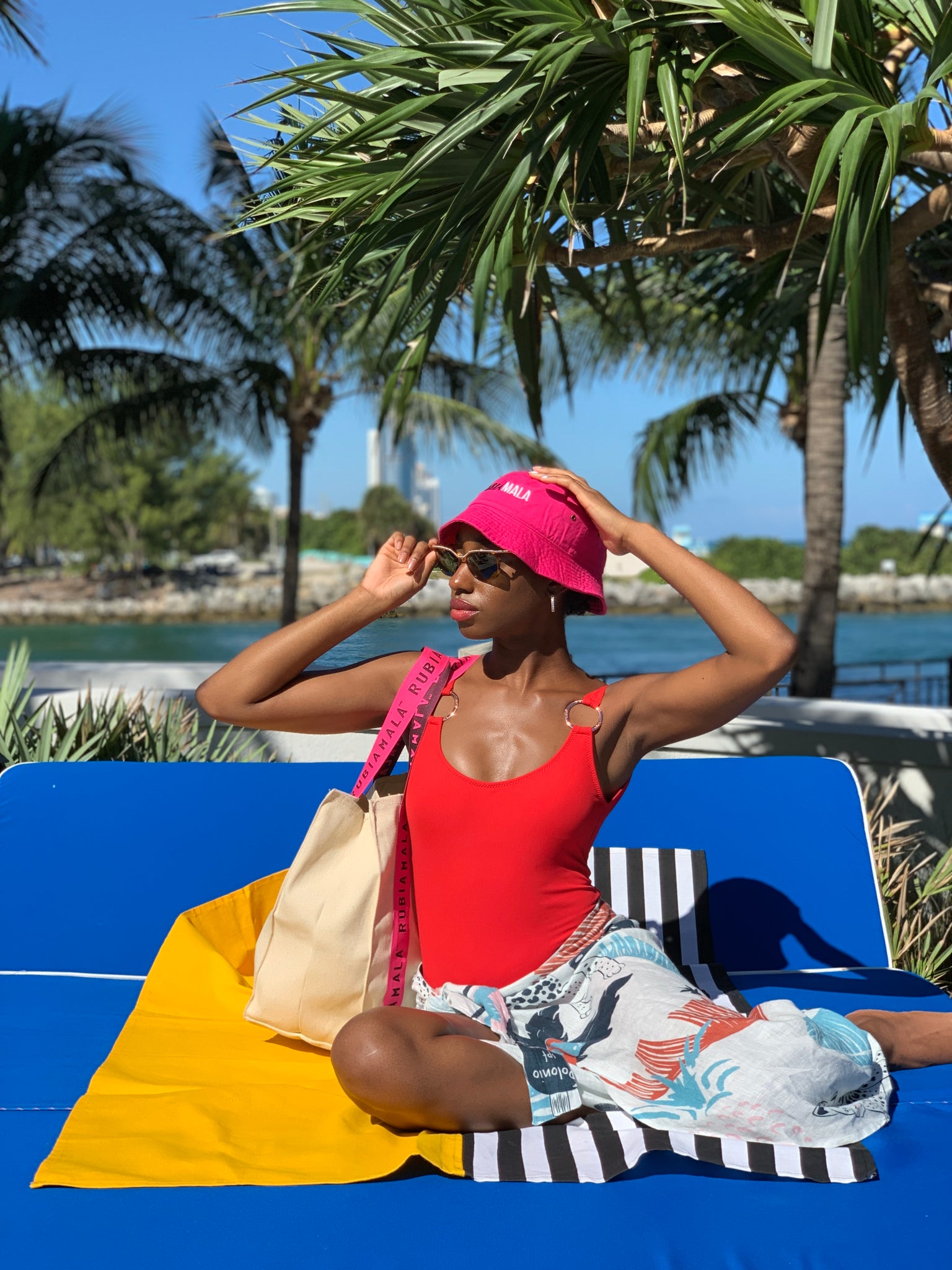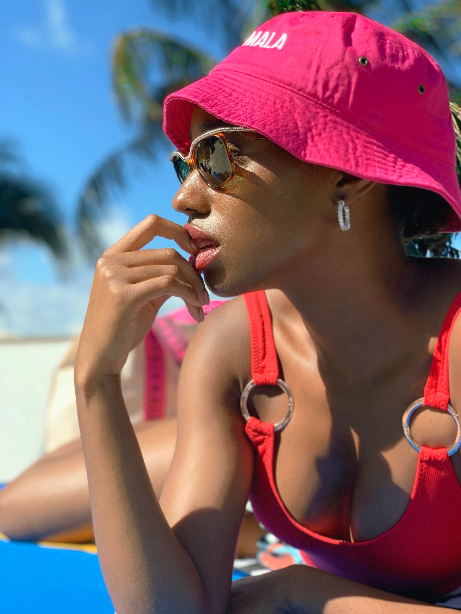Sombrero estilo pescador de algodón con bordado de "Rubiamala" en dos colores. Hay dos talles.