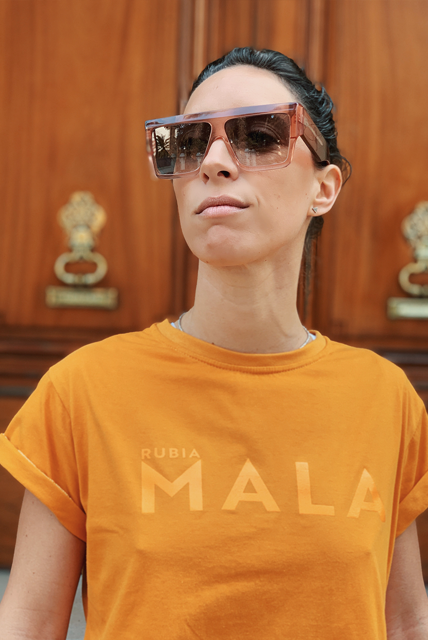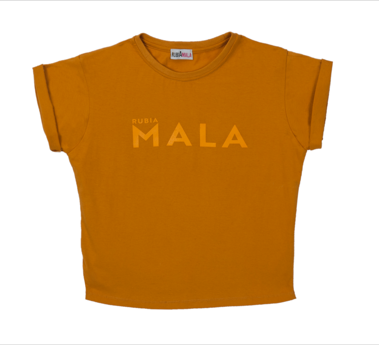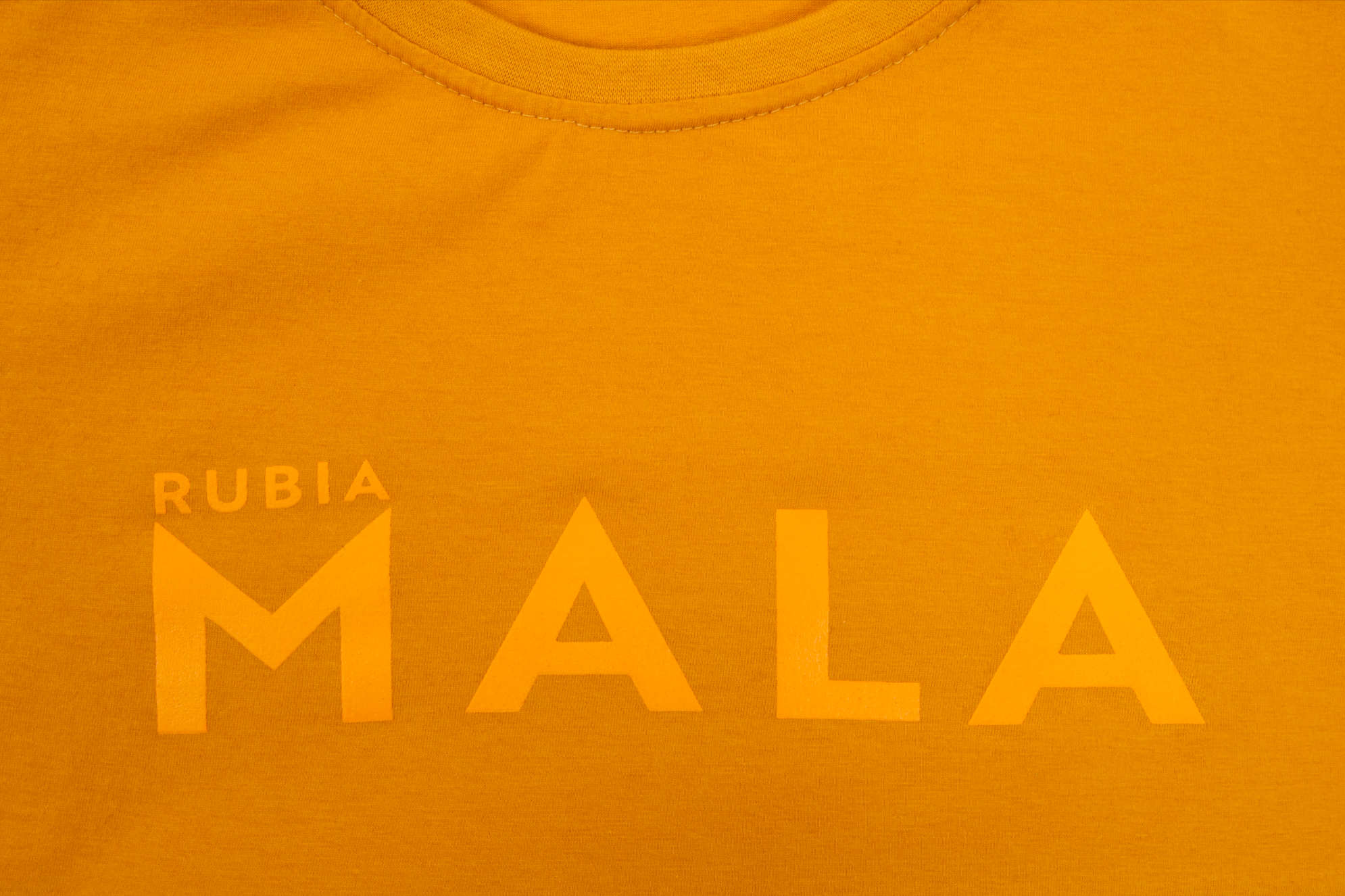 Remera 100% algodón hecha en Uruguay con inscripción "rubia MALA" en el frente.